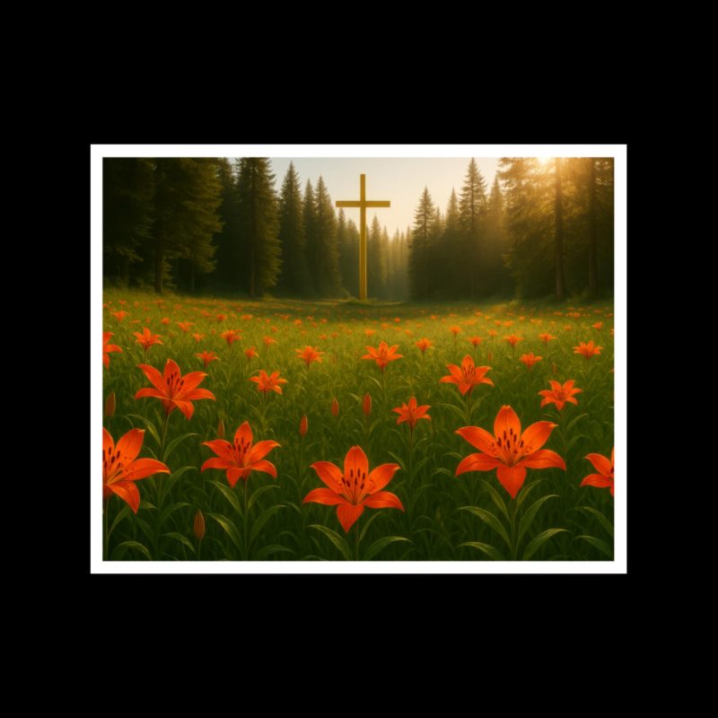 Orange lily field with cross and forest, landscape