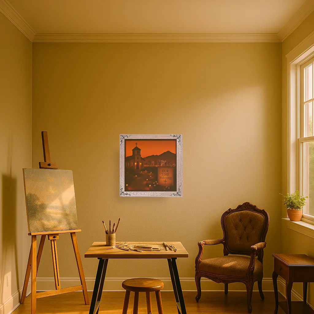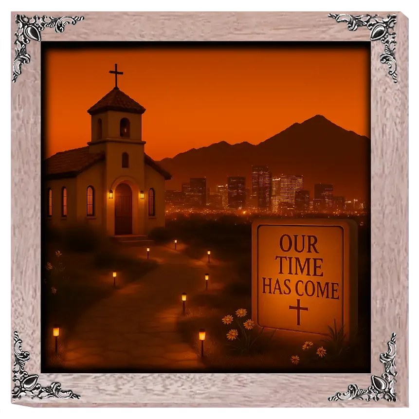 A square art print of a mission chapel at sunset over the Phoenix skyline, glowing with the faith-filled message ‘Our Time Has Come‘.