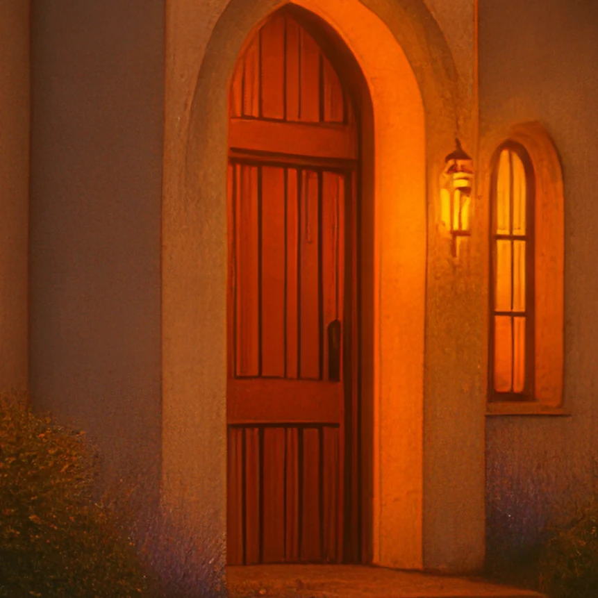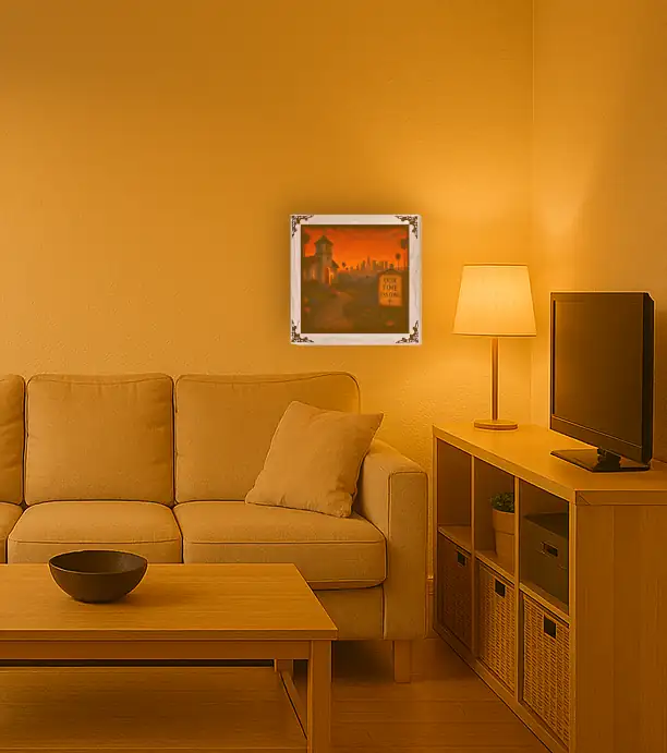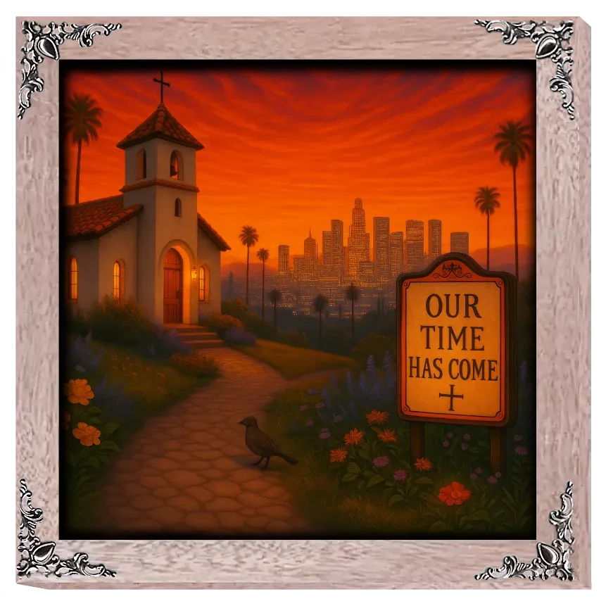 A California mission-style chapel glowing beneath a vivid orange sunset with the Los Angeles skyline beyond. The sign ‘Our Time Has Come’ shines warmly among flowers and palm trees.