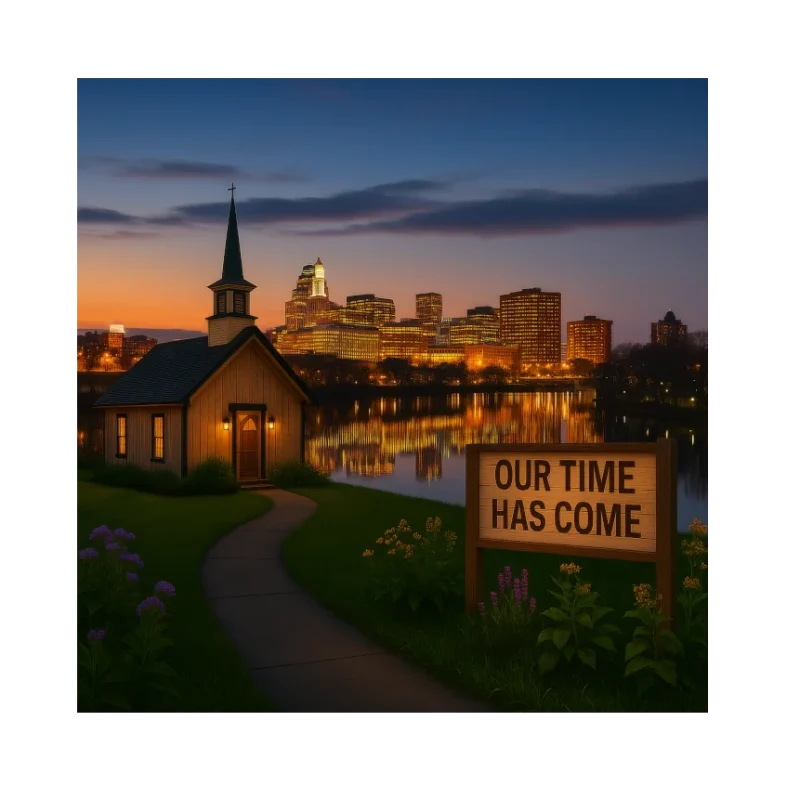 A New England chapel surrounded by crimson autumn trees and the Connecticut River below. A golden sunset illuminates the message ‘Our Time Has Come’.