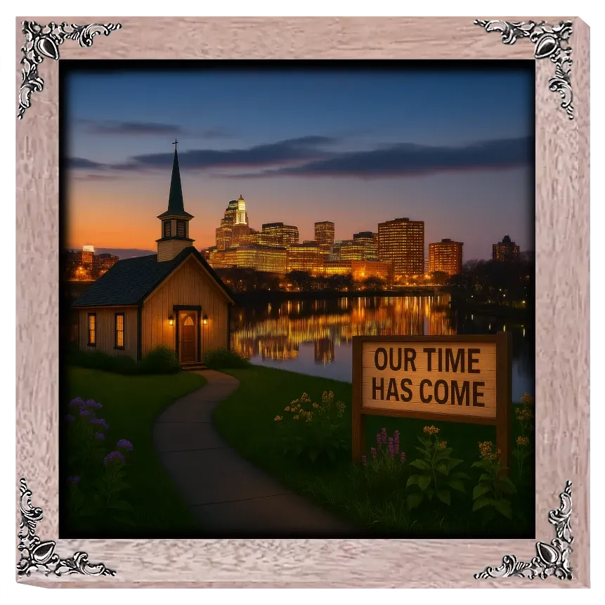 A New England chapel surrounded by crimson autumn trees and the Connecticut River below. A golden sunset illuminates the message ‘Our Time Has Come’.