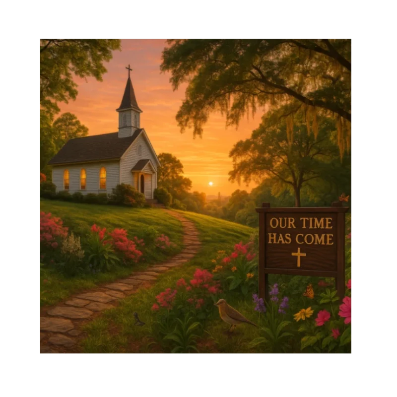 A quaint country church glows warmly in the golden Georgia sunset, nestled among flowering gardens and framed by graceful Southern trees. The sign reading ‘OUR TIME HAS COME’ adds an uplifting, faith-filled message to this peaceful pastoral scene.