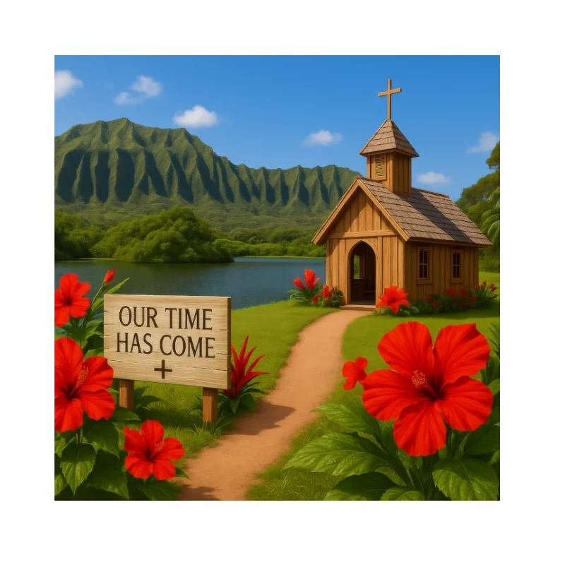 A small wooden chapel rests peacefully beside a tropical lake in Hawaii, framed by brilliant red hibiscus flowers and the dramatic ridges of lush green mountains. The sign reading ‘OUR TIME HAS COME’ adds a hopeful, uplifting message to this sunlit island sanctuary.