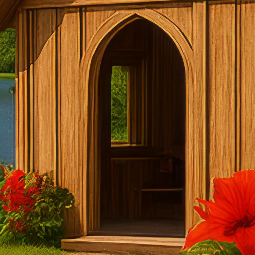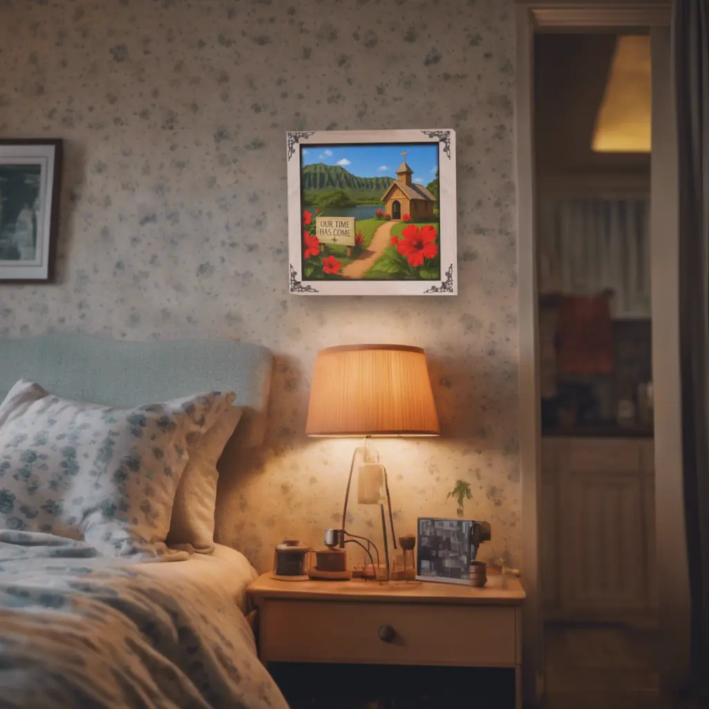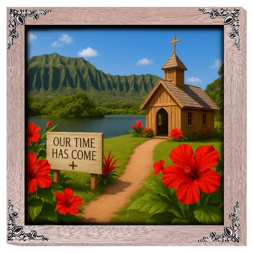 A small wooden chapel rests peacefully beside a tropical lake in Hawaii, framed by brilliant red hibiscus flowers and the dramatic ridges of lush green mountains. The sign reading ‘OUR TIME HAS COME’ adds a hopeful, uplifting message to this sunlit island sanctuary.