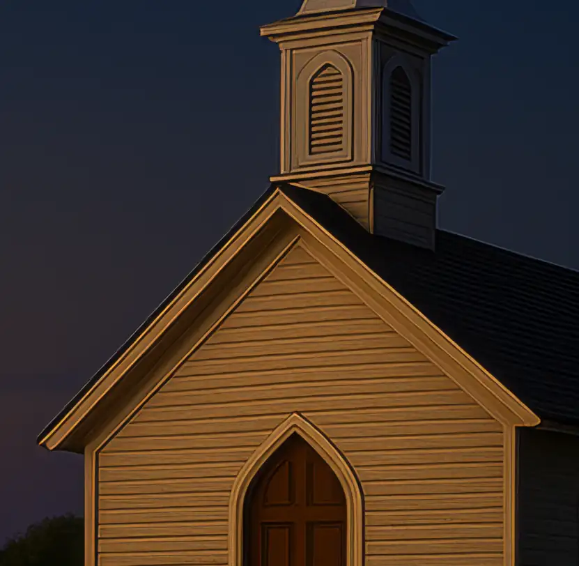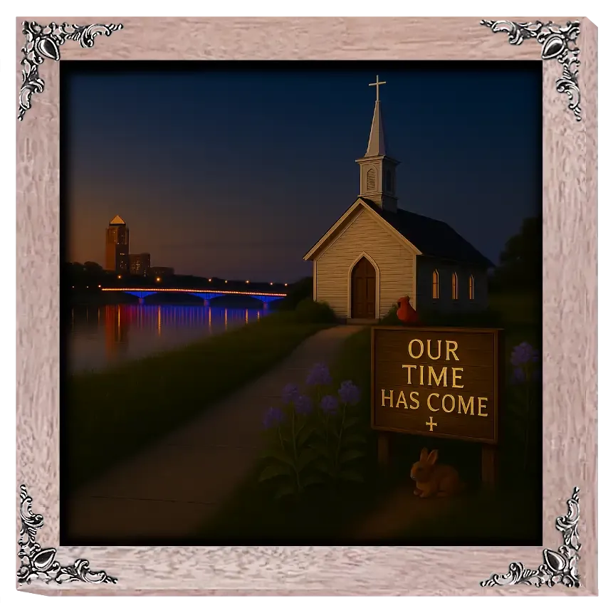 A peaceful riverside chapel glows warmly at dusk in Iowa, with the downtown skyline and a brilliantly lit bridge reflecting across the calm water. The sign reading ‘OUR TIME HAS COME’ adds a hopeful, faith-filled message to this quiet Midwestern evening scene, complete with soft flowers, a perched cardinal, and a small bunny resting nearby.