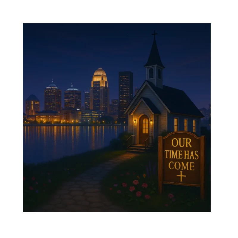 A softly glowing chapel stands by the river in Kentucky, with the illuminated Louisville skyline reflecting warmly across the water. The sign reading ‘OUR TIME HAS COME’ adds a hopeful, faith-filled message to this peaceful Bluegrass evening scene.