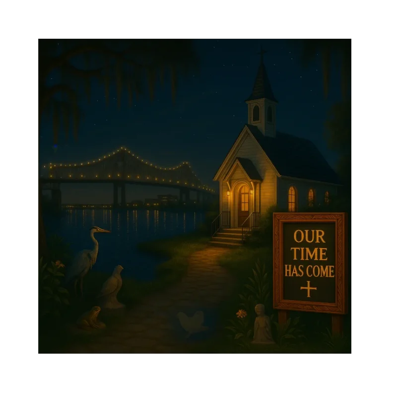 A warmly lit chapel stands along the Louisiana waterfront at night, with a softly glowing bridge and hanging moss creating a distinctly Southern, bayou-evening atmosphere. The sign reading ‘OUR TIME HAS COME’ adds a hopeful, faith-filled message to this tranquil scene, complete with herons, gentle water reflections, and warm golden light.