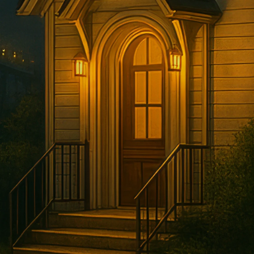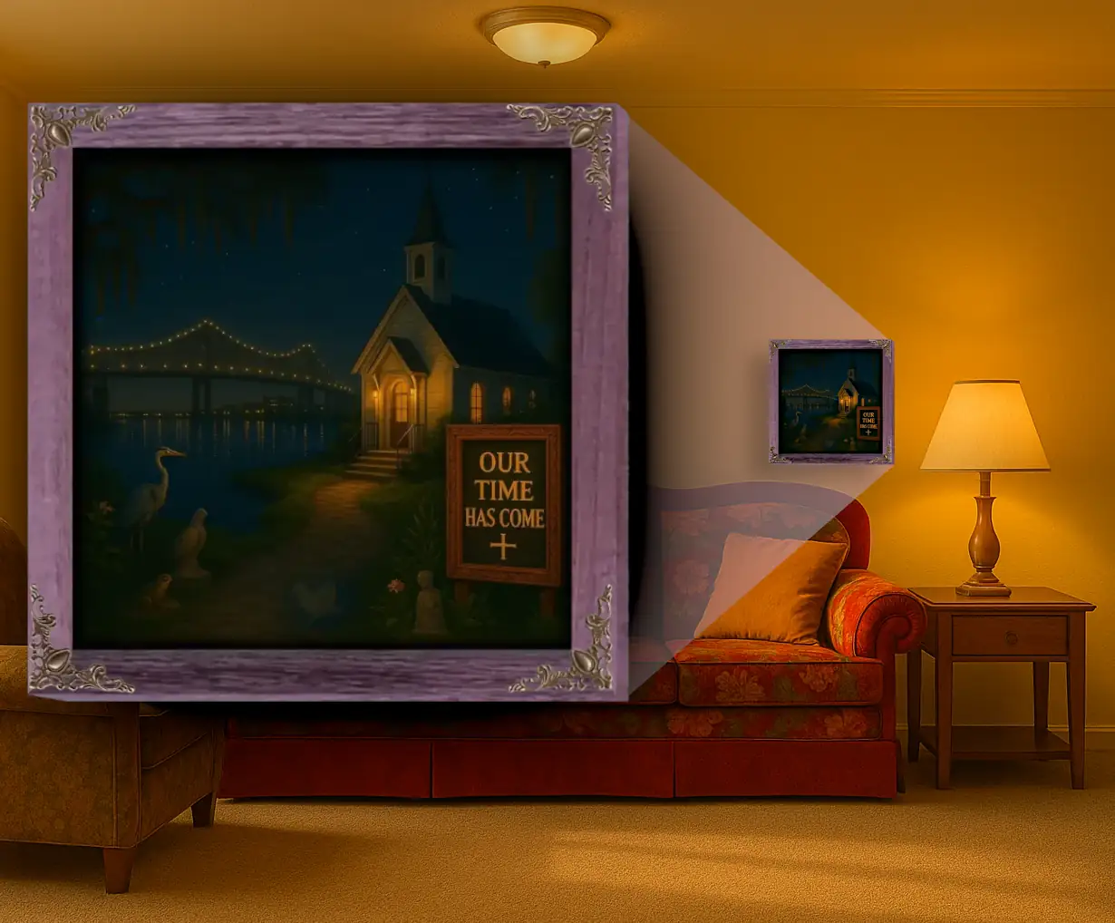 A warmly lit chapel stands along the Louisiana waterfront at night, with a softly glowing bridge and hanging moss creating a distinctly Southern, bayou-evening atmosphere. The sign reading ‘OUR TIME HAS COME’ adds a hopeful, faith-filled message to this tranquil scene, complete with herons, gentle water reflections, and warm golden light.