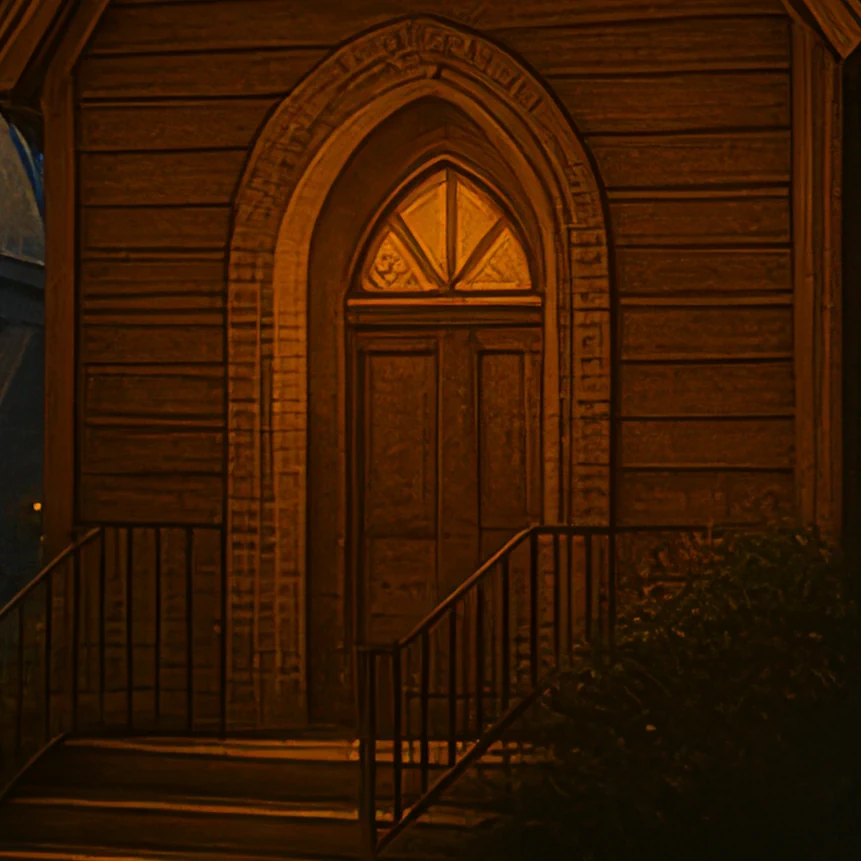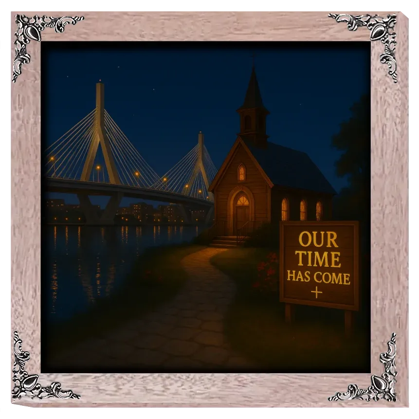 A warmly lit wooden chapel rests along the riverbank under a clear New England night sky, its glow reflected softly in the dark water. Behind it, the illuminated Zakim Bridge rises in elegant cables and towers, placing this quiet place of faith in the heart of Boston’s iconic landscape.