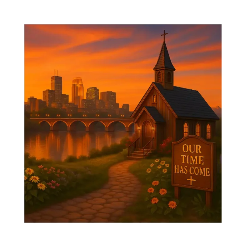 A warm Minnesota sunset settles over the quiet chapel as its lights glow gently along the riverbank, framed by late-summer flowers. Across the water, the iconic Minneapolis skyline and the graceful arches of the Stone Arch Bridge rise in silhouette, while the sign proclaiming ‘OUR TIME HAS COME’ anchors the scene in hope and purpose.