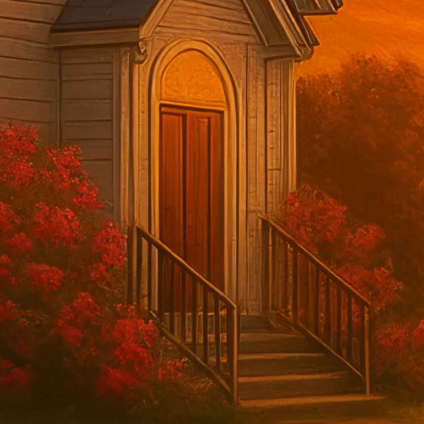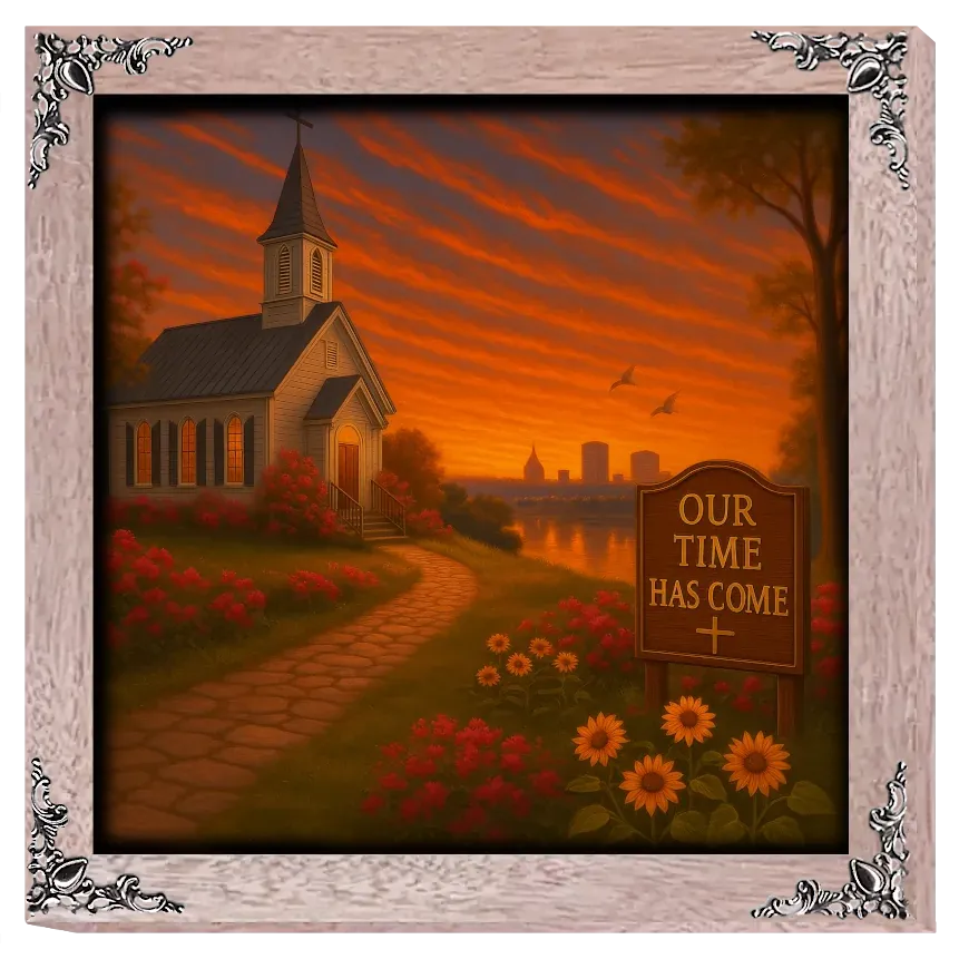 A gentle Mississippi sunset bathes the little chapel in warm amber light as it rests beside the slow, reflective river. In the distance, the familiar Southern skyline and bridge silhouette frame the scene, while the sign declaring ‘OUR TIME HAS COME’ gives the landscape a message of faith, resilience, and renewal.
