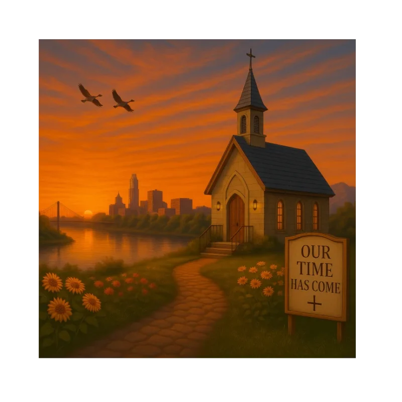 A glowing Nebraska sunset reflects across the calm river as the chapel stands warmly lit among fields of sunflowers and soft prairie blooms. With the Omaha skyline rising beyond the bridge and two geese gliding overhead, the sign marked ‘Our Time Has Come’ grounds the scene in a message of hope across the Heartland.