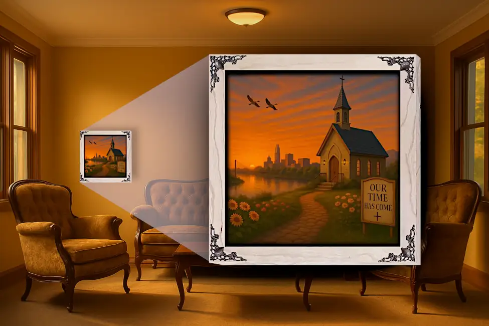 A glowing Nebraska sunset reflects across the calm river as the chapel stands warmly lit among fields of sunflowers and soft prairie blooms. With the Omaha skyline rising beyond the bridge and two geese gliding overhead, the sign marked ‘Our Time Has Come’ grounds the scene in a message of hope across the Heartland.