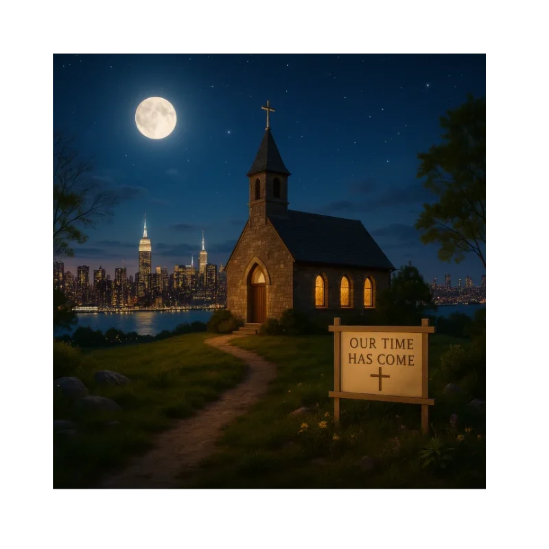 A clear New York night glows under a full moon as the chapel shines warmly on its quiet hill overlooking the Hudson. Across the water, the Empire State Building and the city’s iconic skyline sparkle against the deep blue sky, while the sign reading ‘Our Time Has Come’ anchors the scene in a message of hope rising over the Empire State.