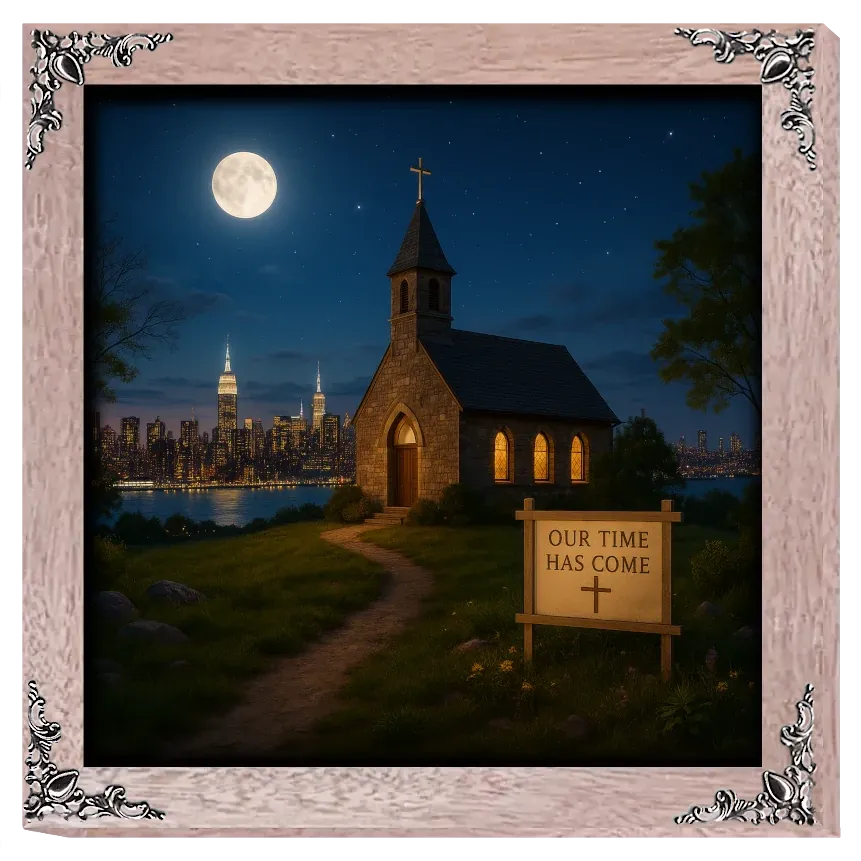 A clear New York night glows under a full moon as the chapel shines warmly on its quiet hill overlooking the Hudson. Across the water, the Empire State Building and the city’s iconic skyline sparkle against the deep blue sky, while the sign reading ‘Our Time Has Come’ anchors the scene in a message of hope rising over the Empire State.