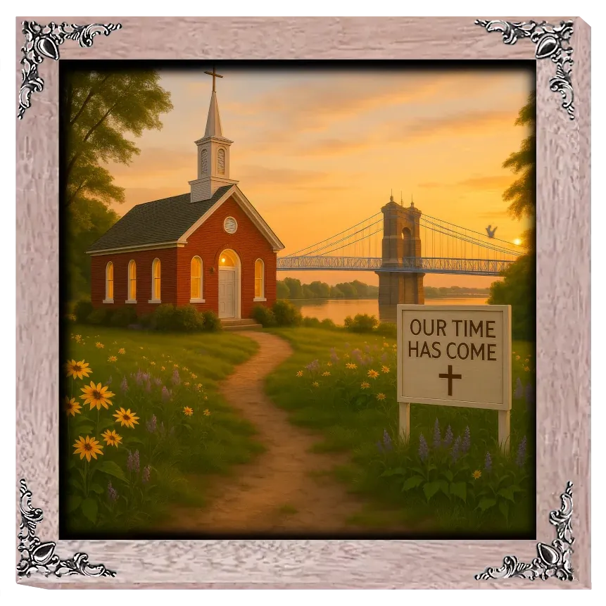 A gentle Ohio sunrise spreads golden light across the riverbank as the red-brick chapel stands peacefully beneath the soft morning sky. With the historic Cincinnati suspension bridge glowing in the distance and fields of daisies and lupines in bloom, the sign reading ‘Our Time Has Come’ anchors the scene in a spirit of renewal across the Buckeye State.