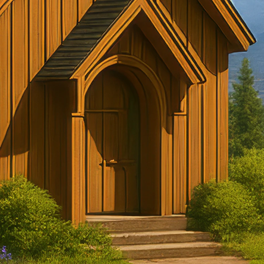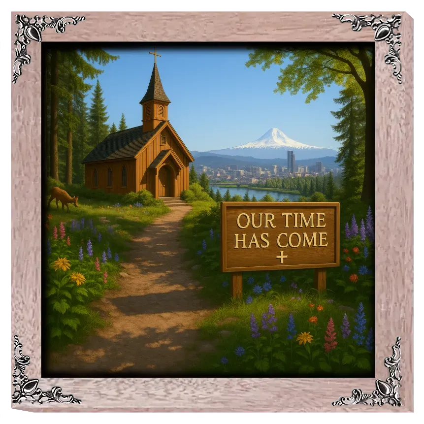A bright Oregon morning unfolds under a clear sky as the wooden chapel stands nestled among evergreens and wild lupines. With a deer grazing nearby and Mount Hood rising in breathtaking clarity beyond the Portland skyline, the sign reading ‘Our Time Has Come’ offers a message of hope rooted in the beauty of the Pacific Northwest.