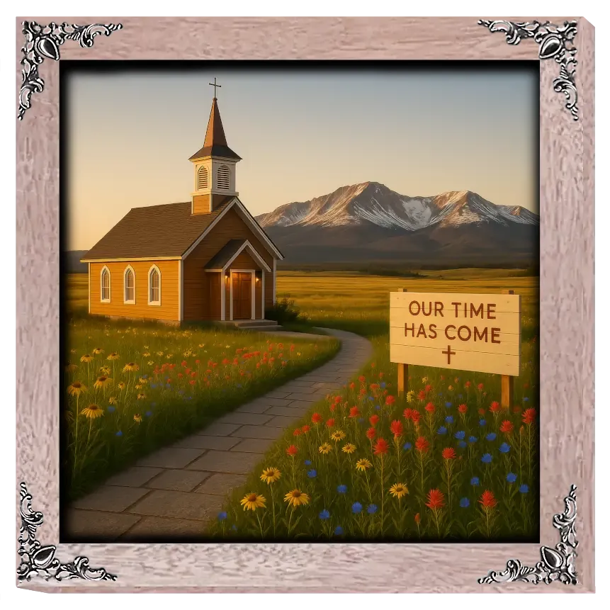 Golden Wyoming light stretches across an open prairie as a small wooden chapel stands quietly beneath snow-touched mountain peaks in the distance. Wildflowers line the winding path, and a simple sign reading ‘Our Time Has Come’ rests among the blooms, carrying a message of steady faith across the wide Western sky.