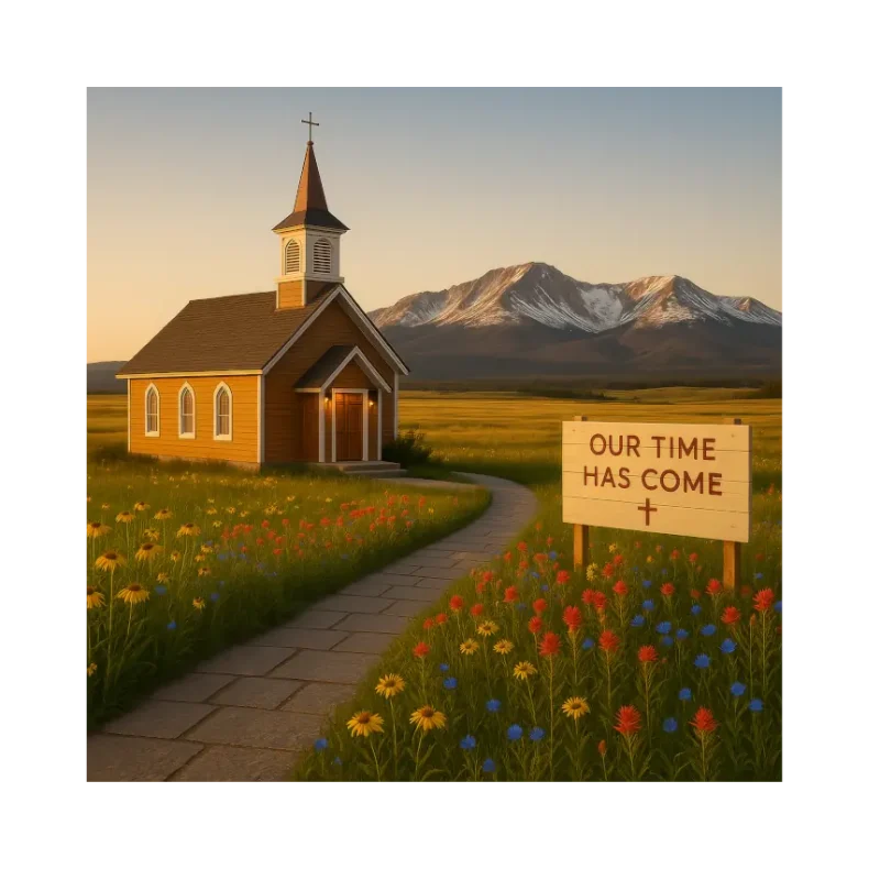 Golden Wyoming light stretches across an open prairie as a small wooden chapel stands quietly beneath snow-touched mountain peaks in the distance. Wildflowers line the winding path, and a simple sign reading ‘Our Time Has Come’ rests among the blooms, carrying a message of steady faith across the wide Western sky.