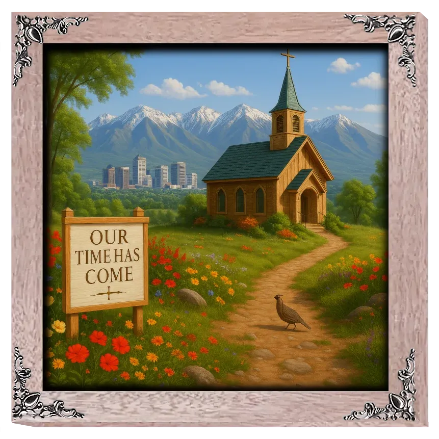 Bright Utah sunshine illuminates the wooden chapel nestled among wildflowers as the Wasatch Mountains rise in majestic clarity beyond the Salt Lake City skyline. A quail wanders the path, and the sign declaring ‘Our Time Has Come’ brings a hopeful message to this scene of mountain beauty and profound stillness in the Beehive State.