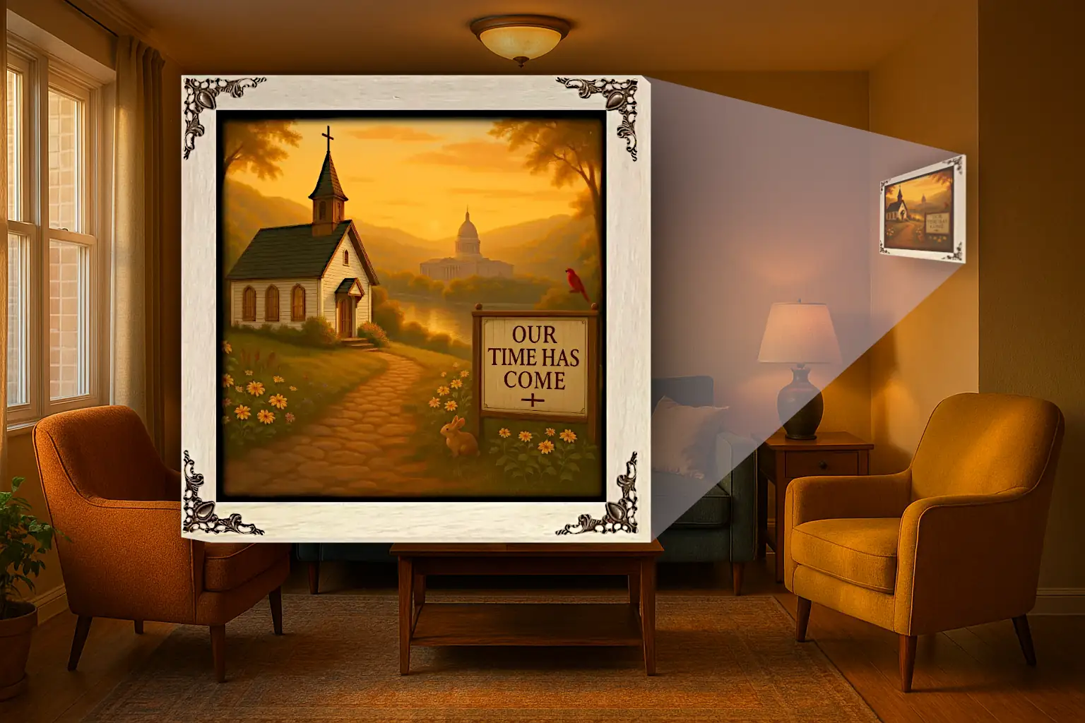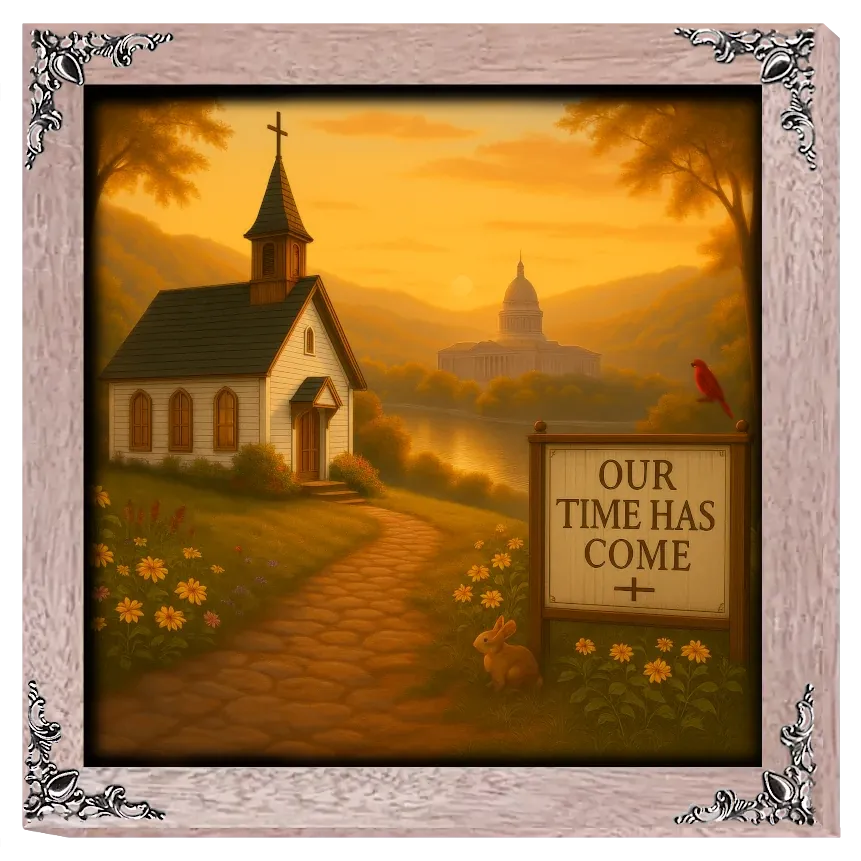 A warm hillside chapel glows in the golden evening light as the Capitol dome rises softly in the misty distance. Wildflowers, gentle valleys, and a curious woodland deer complete this peaceful West Virginia scene – quietly proclaiming ‘Our Time Has Come.’