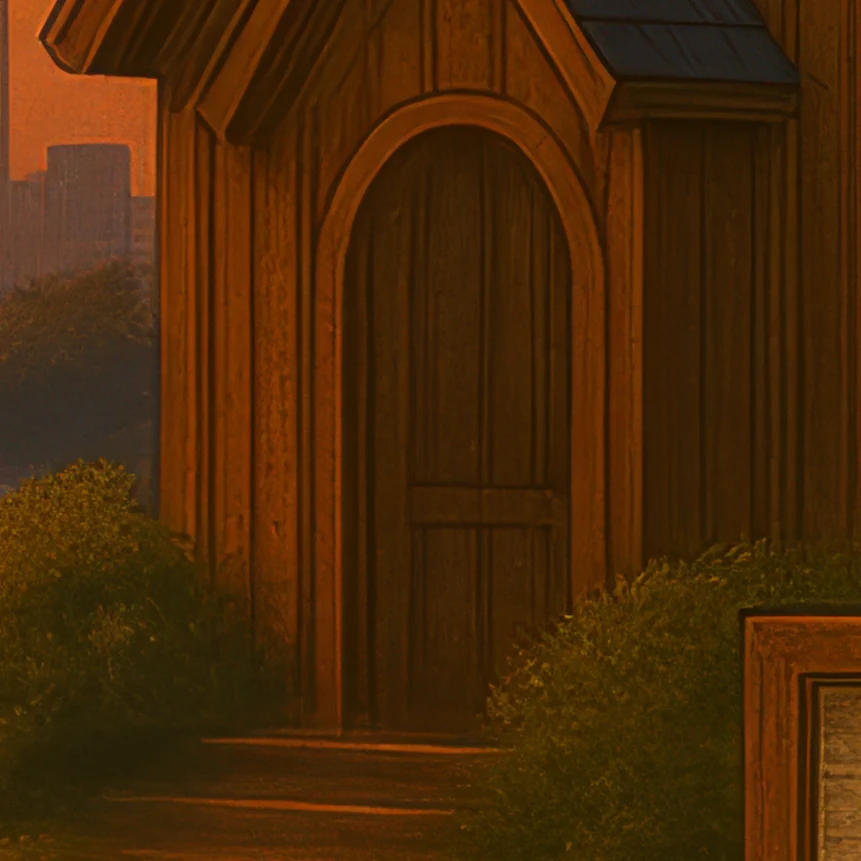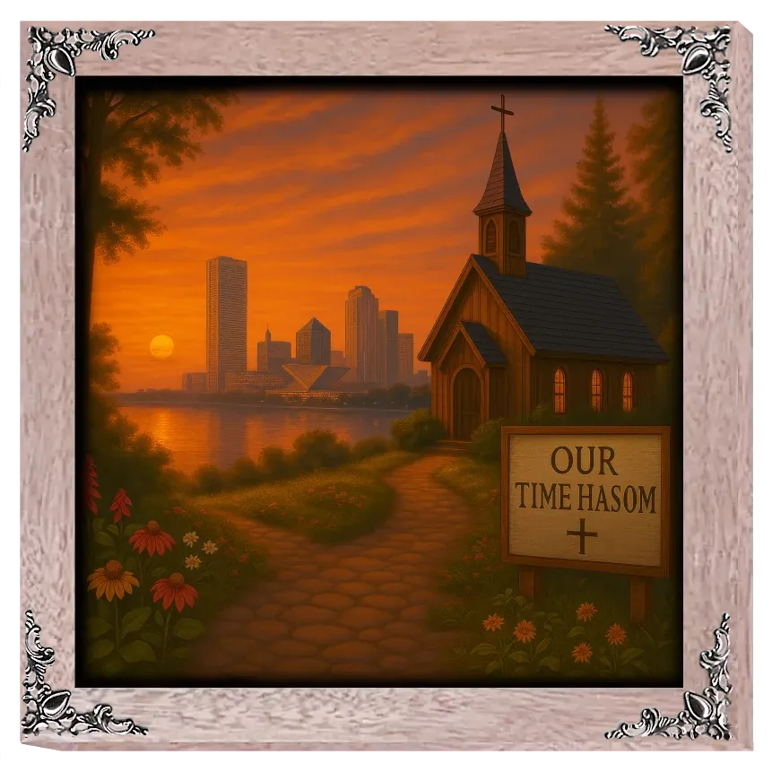 A lakeside chapel welcomes the sunset as Milwaukee’s skyline glimmers across the water. Coneflowers, summer greenery, and the warm glow of twilight create a serene Wisconsin moment filled with hope and new beginnings.
